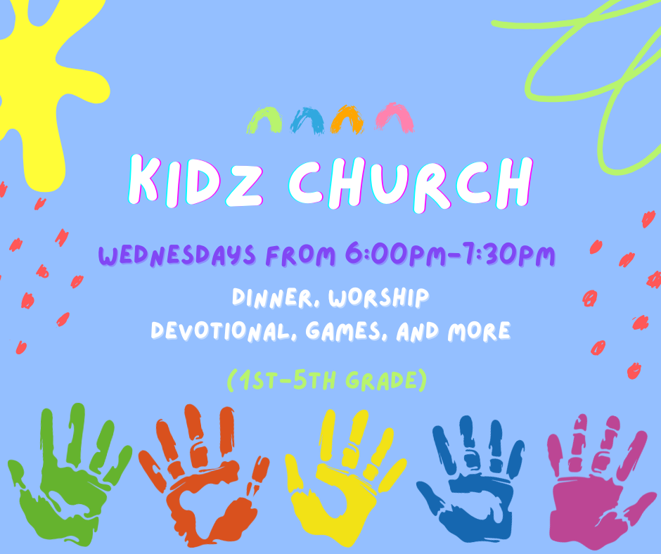 Kidz Church is held every Wednesday night from 6:00-7:30 for 1st-5th graders! Dinner is provided