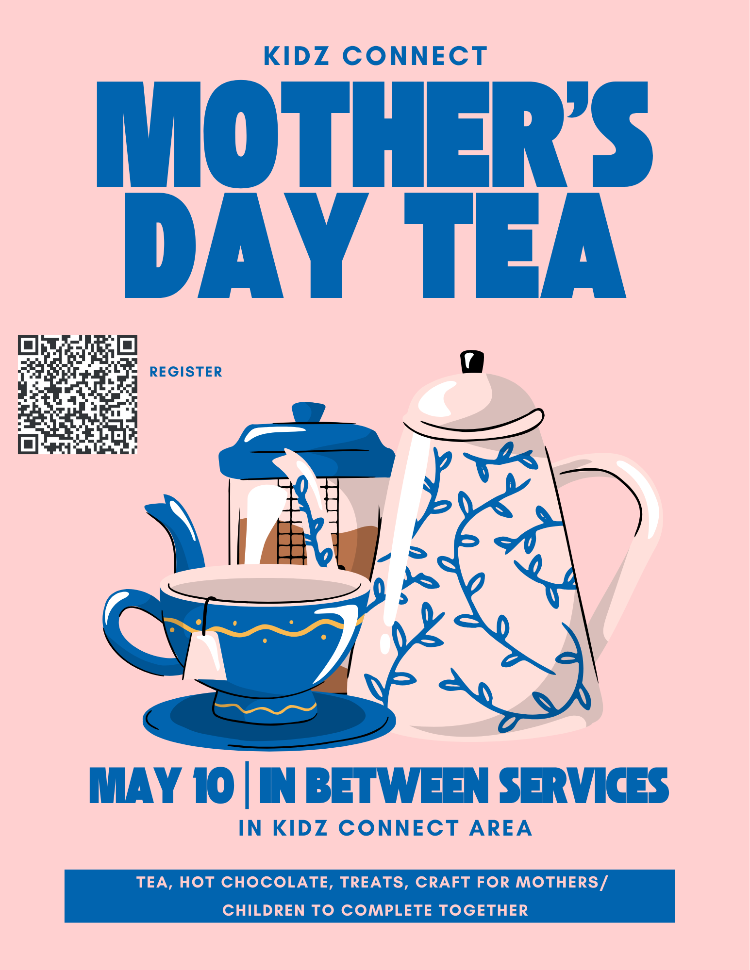 Join us for an in-between services Mother’s Day celebration on May 10th. We will have tea, hot chocolate, yummy treats, and a fun craft. Stop by after the first service ends or before the second one begins to enjoy. Register using the QR code or on ChurchCenter